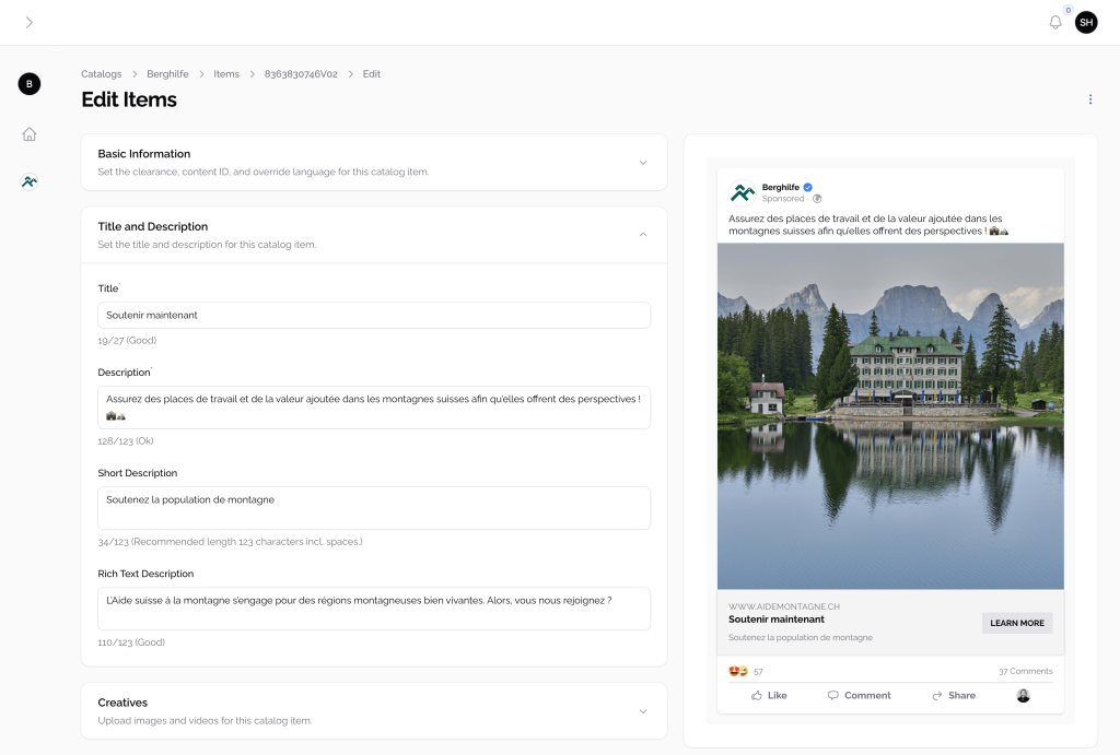 Within Verze.ai, you can create and manage text, image, video, and language variants. These approved assets can be exported and synchronized with platforms such as Meta Ads Manager.